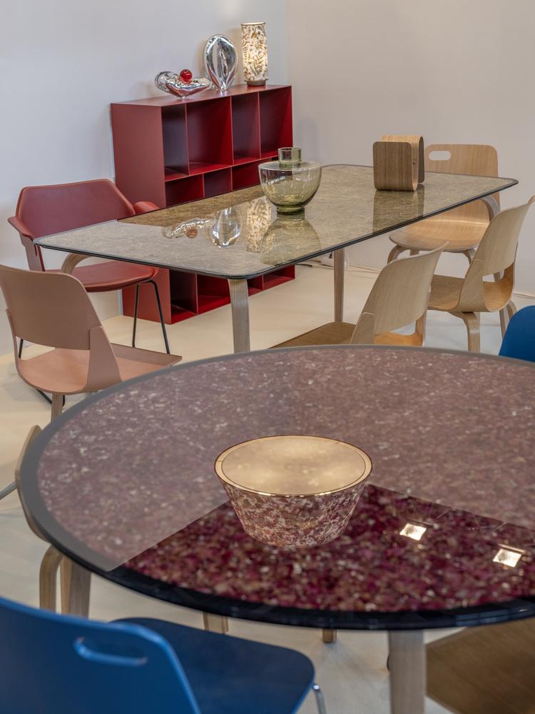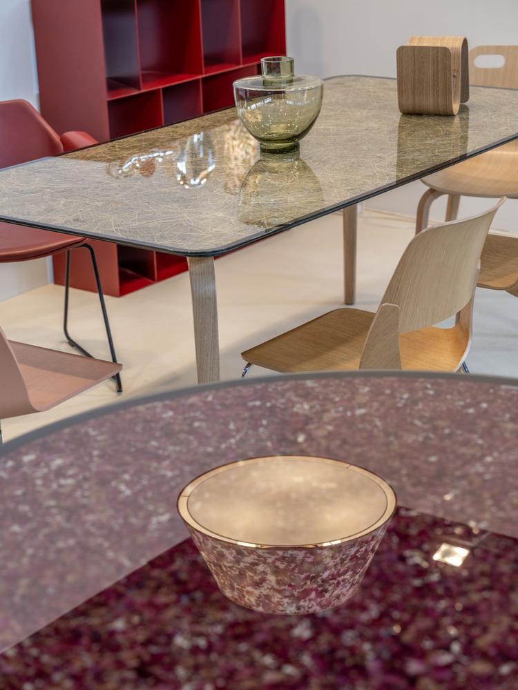 Az asztalok lábai a Plydesign hajlított rétegelt lemez konstrukciójára épülnek — ugyanaz a formai logika jelenik meg az asztaloknál és a székeknél. A Viaplant ezt az alapot használja arra, hogy a növényeket új kontextusba helyezze: üvegbe zárva, asztallapként jelennek meg, egyszerre természetes és tárgyszerű formában. Az installáció így egy egységes rendszerré válik, ahol anyag, szerkezet és növény együtt működnek.